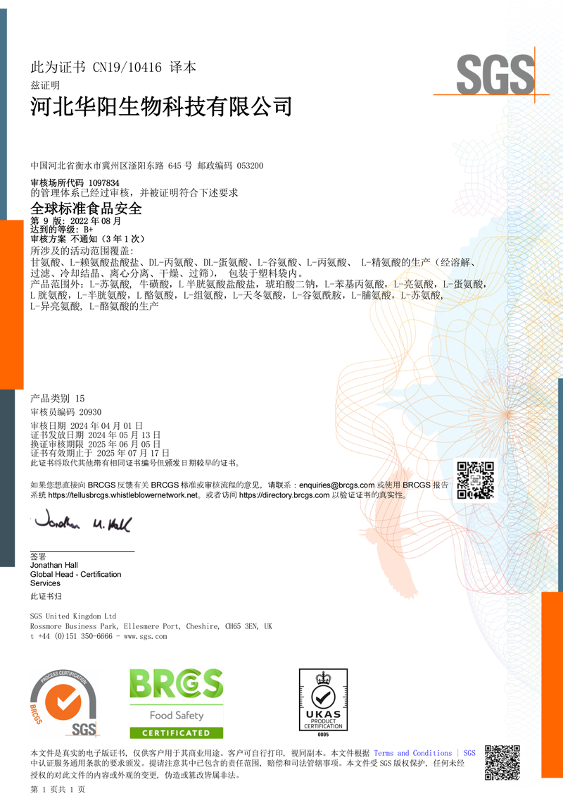 河北華陽集團坐落于河北省衡水市冀州區(qū)省級工業(yè)園區(qū)(始建于1987年,前身為冀州市華陽化工有限責任公司)。集團下屬四個公司:河北華陽生物科技有限公司、河北華悅氨基酸科技有限公司、滄州華晨生物科技有限公司、衡水市陽力商貿(mào)有限公司。主要生產(chǎn)甘氨酸、L-丙氨酸、L-蘇氨酸、DL-蛋氨酸、L-賴氨酸鹽酸鹽、L-半胱氨酸鹽酸鹽、干貝素等氨基酸系列食品級產(chǎn)品,廣泛應(yīng)用于食品、飲料、飼料等行業(yè)。......